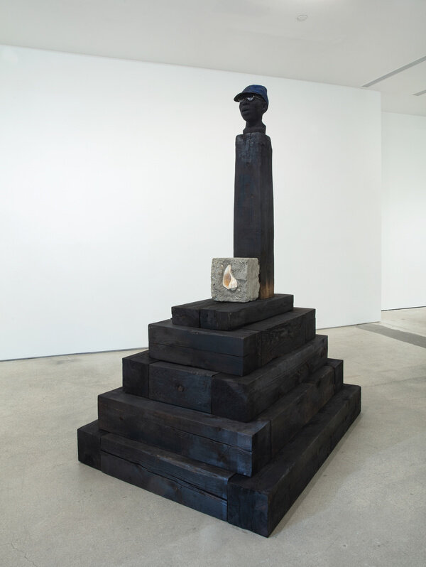 The largescale sculpture, Nommo, exhibited for the first time in the United States, continues Bailey’s exploration of globally connected histories and the dichotomy between stasis and movement. Created for the 2019 Istanbul Biennial, the work rebuilds the structure of a ship with reclaimed wooden beams found in the shipyards of Istanbul, a practice that serves to connect past and present. Embedded within the ship are eight plaster busts. This recurring figure within Bailey’s oeuvre is both individual and communal, a deity-like figure who exists in the liminal space between the historic and the current.