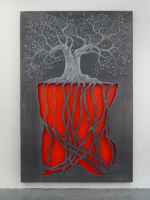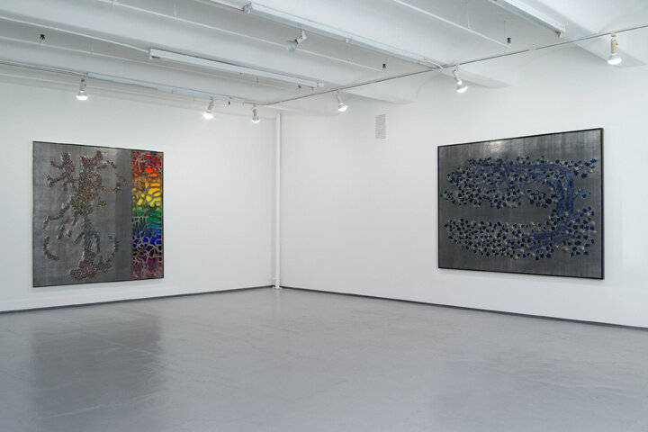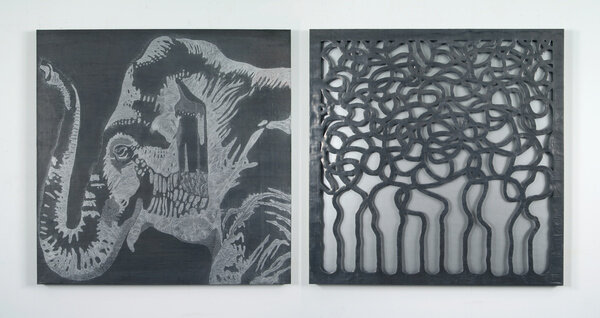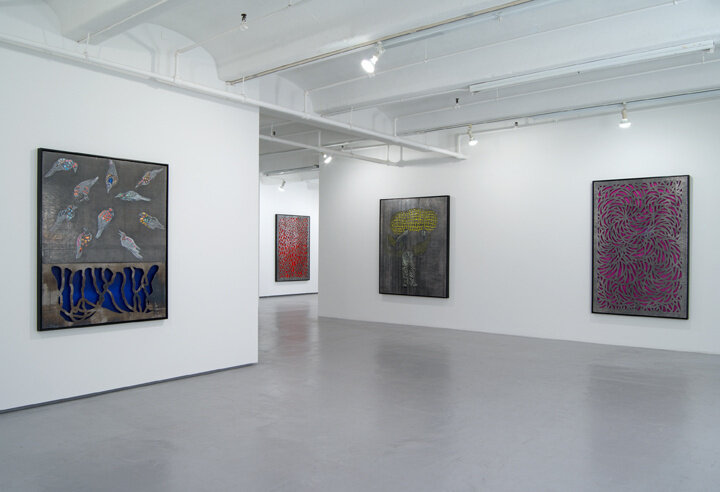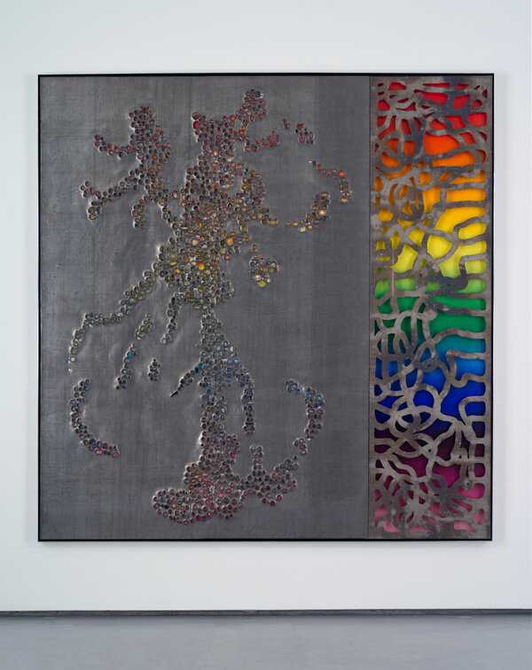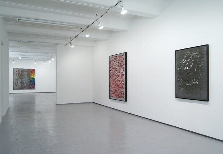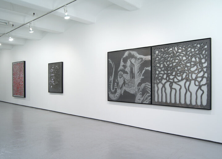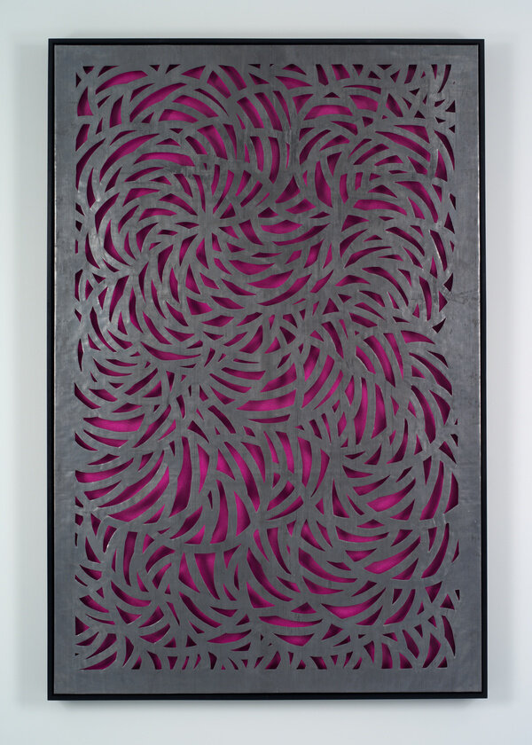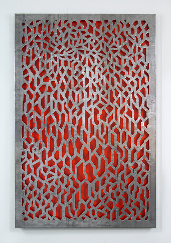 Vega’s new series references traditional latticed screens found in his native Melilla, a Spanish city located in North Africa. These architectural elements, made from ornamental patterns, function as windows in homes and convents. They keep the interiors private while allowing occupants vistas of the public outdoors. Vega transforms large scale malleable lead plates through engraving and deep cuts, producing geometric designs that play with ideas of seeing and being seen. In the haunting I Thought of That, Vega removes large sections of lead, revealing a vivid red field below.