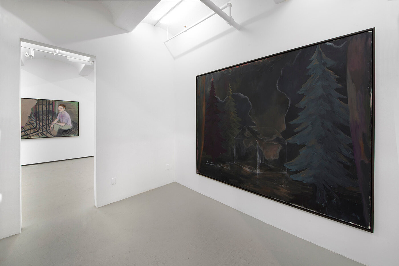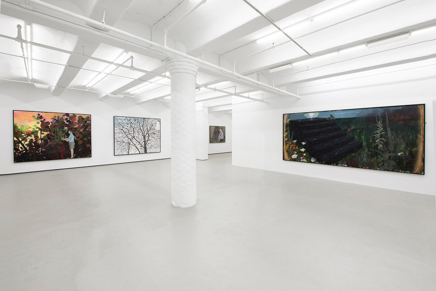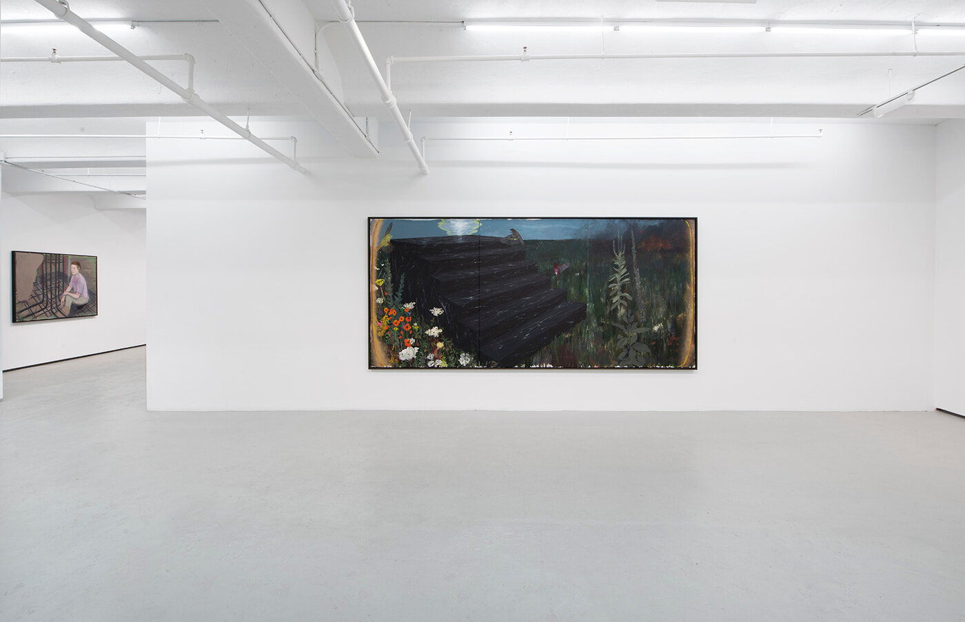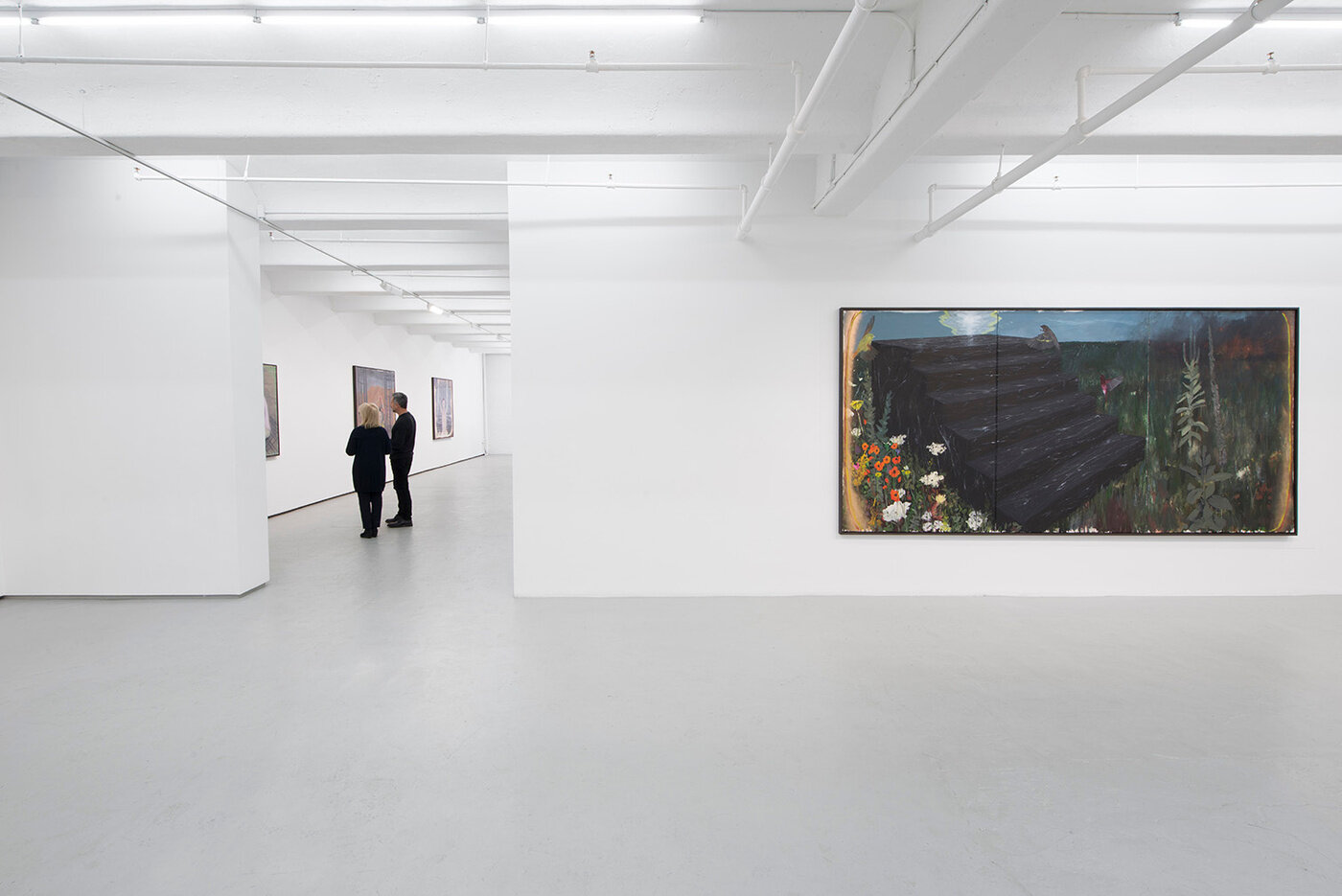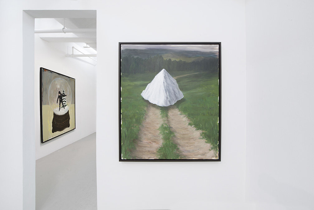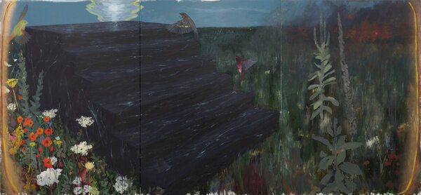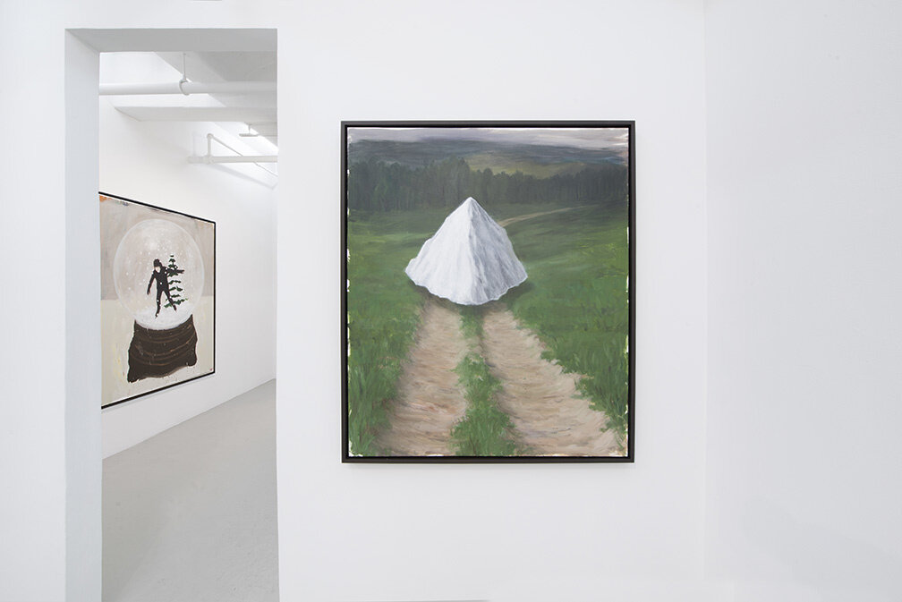 Many of the paintings offer scenes of disrupted journeys or the aftermath of significant episodes: stairs abandoned in fields, snow globes as souvenirs from elsewhere, tattoos that historicize the body, a glass house lost in a cluster of firs, apples frozen and rotting in the tree, and the underlying structure of columns left unfinished. These moments of abandonment and failure also contain the seed of possibility and renewal whose hopefulness echoes the artist's informed but non-cynical approach to art in general and to painting in particular. In The Folktale (2017), marble stairs are isolated in a grassy clearing; they don’t appear to lead anywhere and a fire burns in the distance, but colorful wildflowers sprout, birds flutter, and sunlight ripples suggesting hope and rebirth.