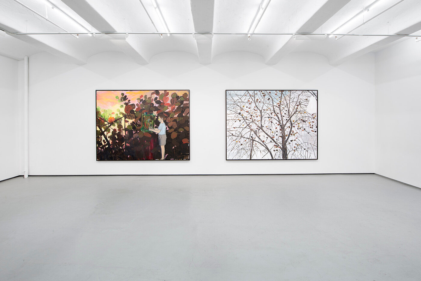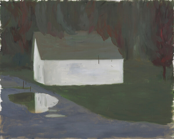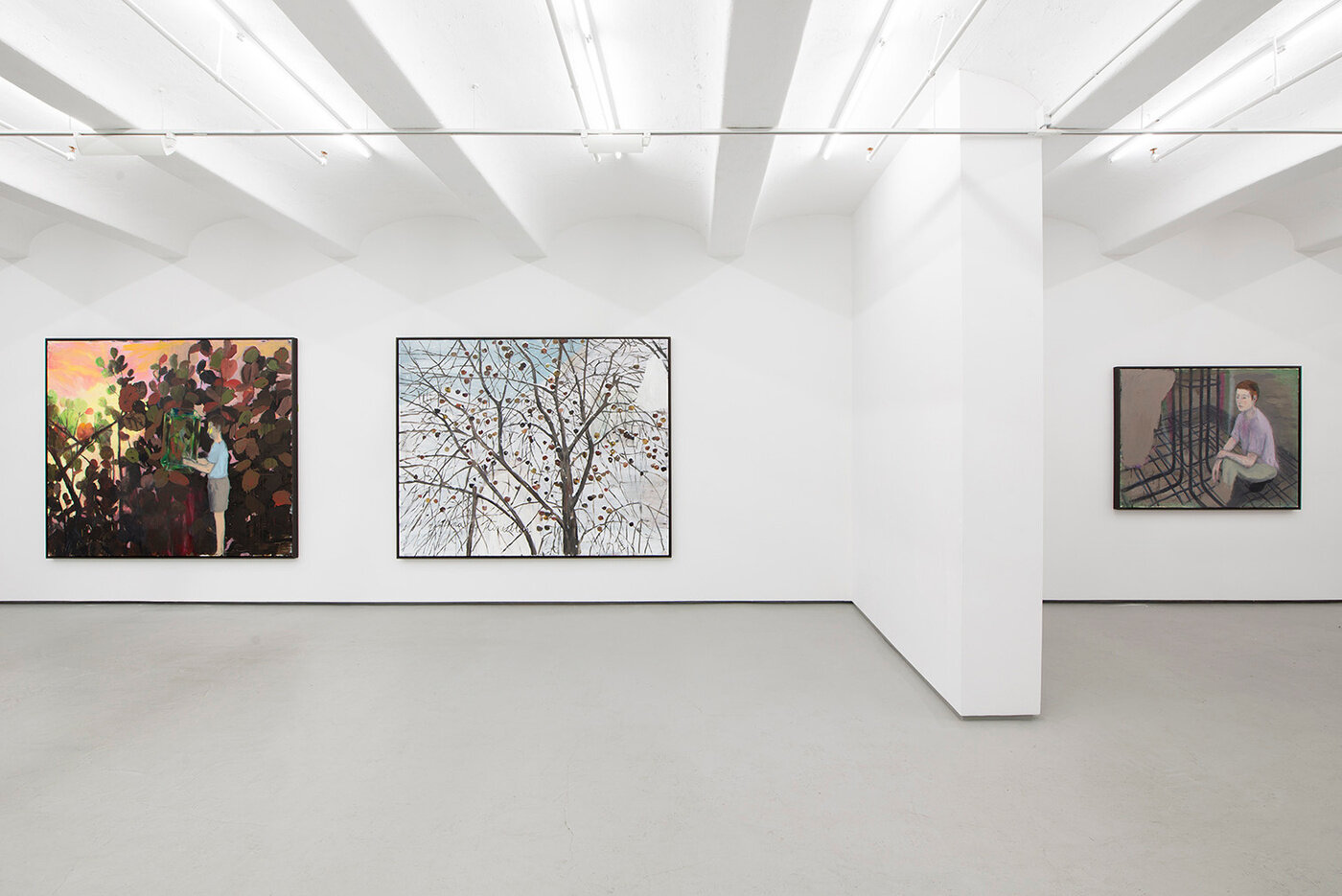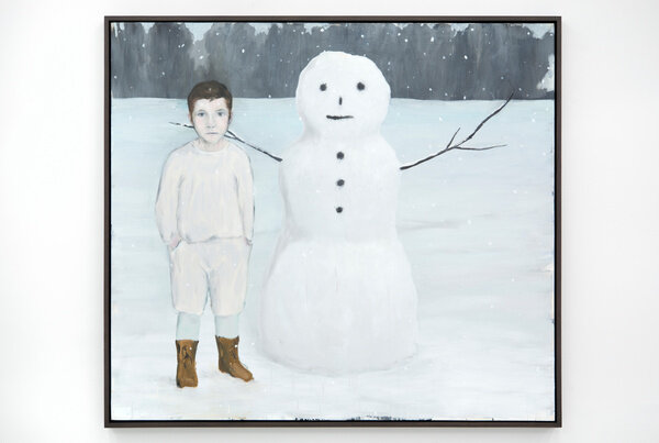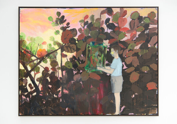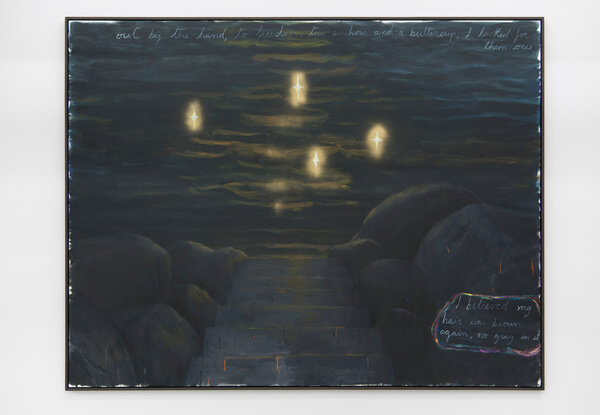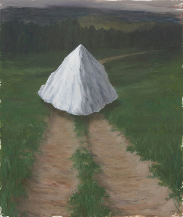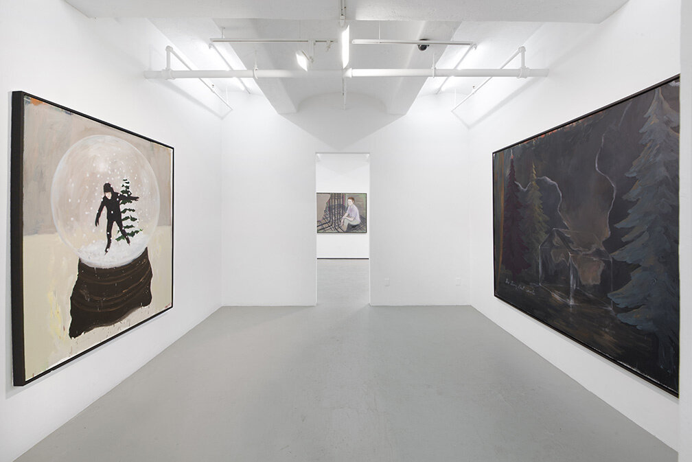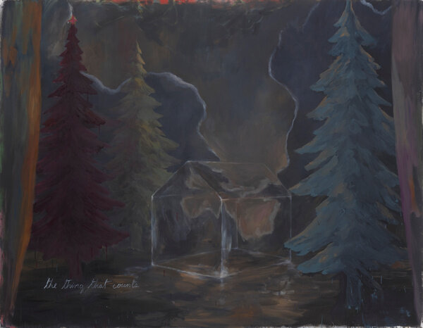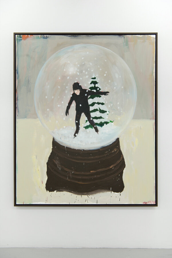 Many of the paintings offer scenes of disrupted journeys or the aftermath of significant episodes: stairs abandoned in fields, snow globes as souvenirs from elsewhere, tattoos that historicize the body, a glass house lost in a cluster of firs, apples frozen and rotting in the tree, and the underlying structure of columns left unfinished. These moments of abandonment and failure also contain the seed of possibility and renewal whose hopefulness echoes the artist's informed but non-cynical approach to art in general and to painting in particular. In The Folktale (2017), marble stairs are isolated in a grassy clearing; they don’t appear to lead anywhere and a fire burns in the distance, but colorful wildflowers sprout, birds flutter, and sunlight ripples suggesting hope and rebirth.