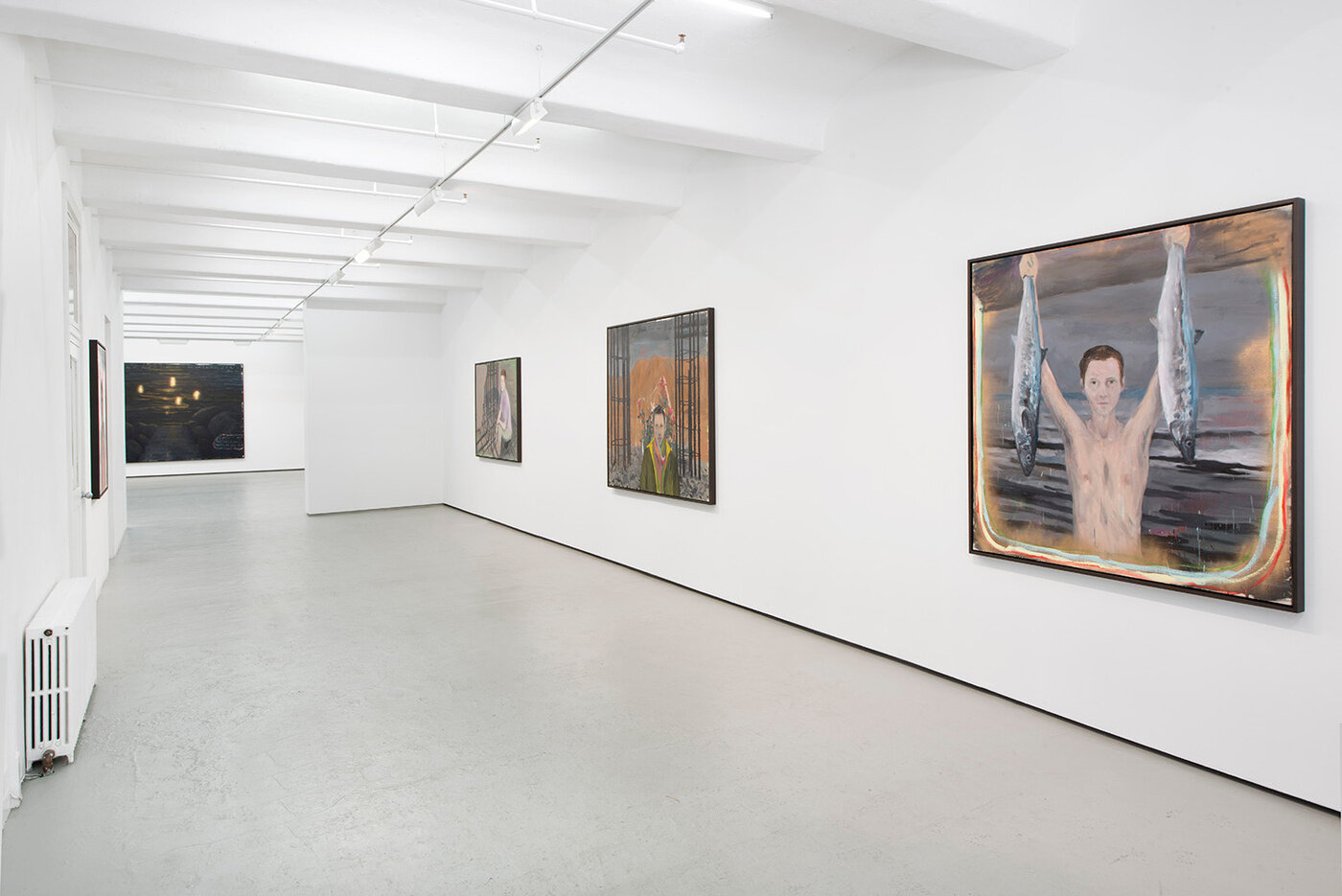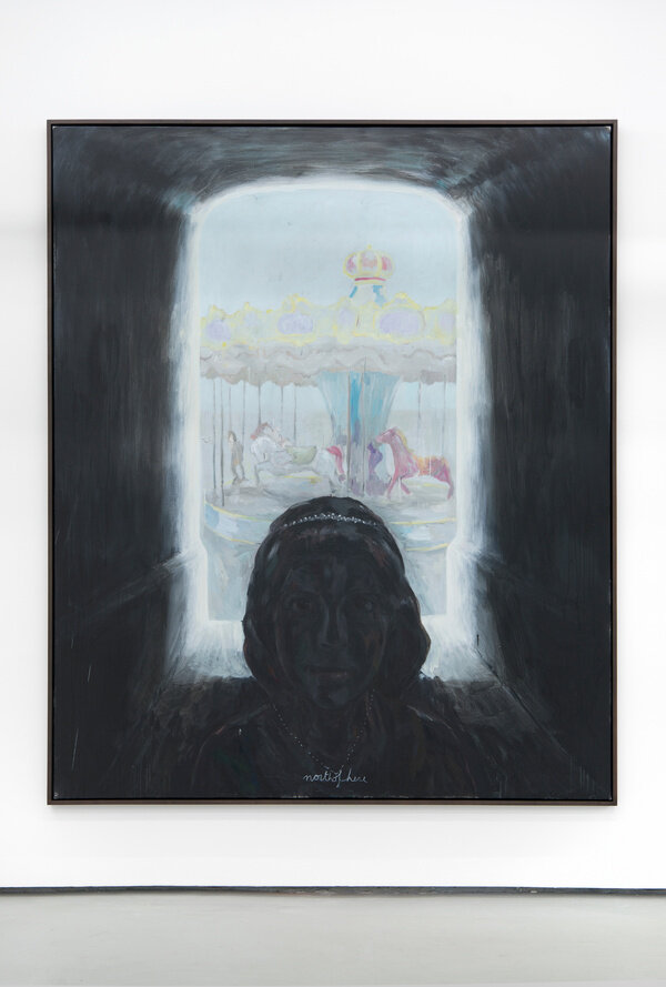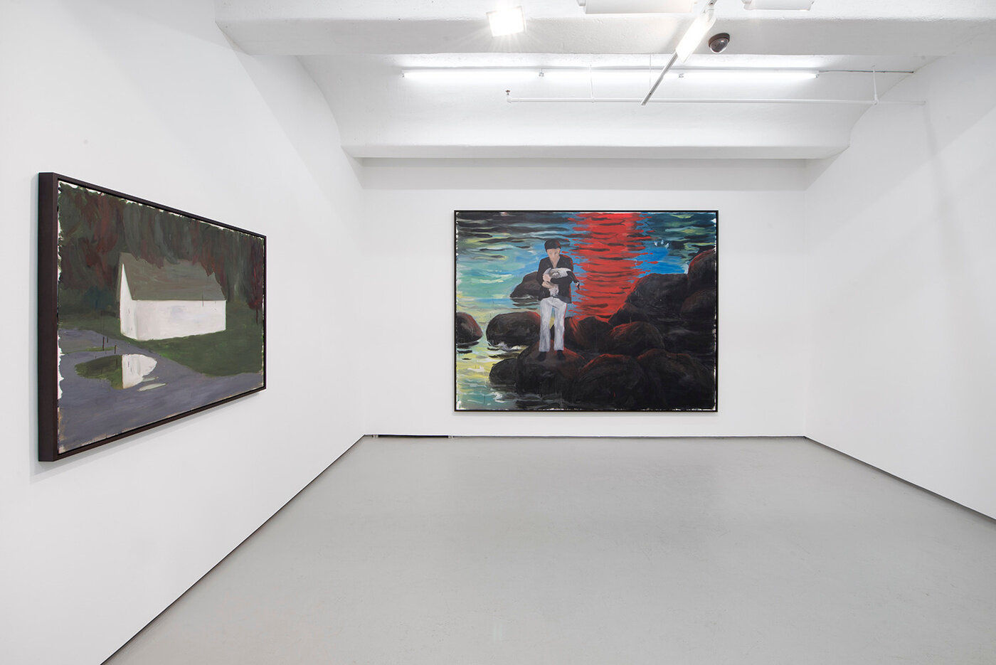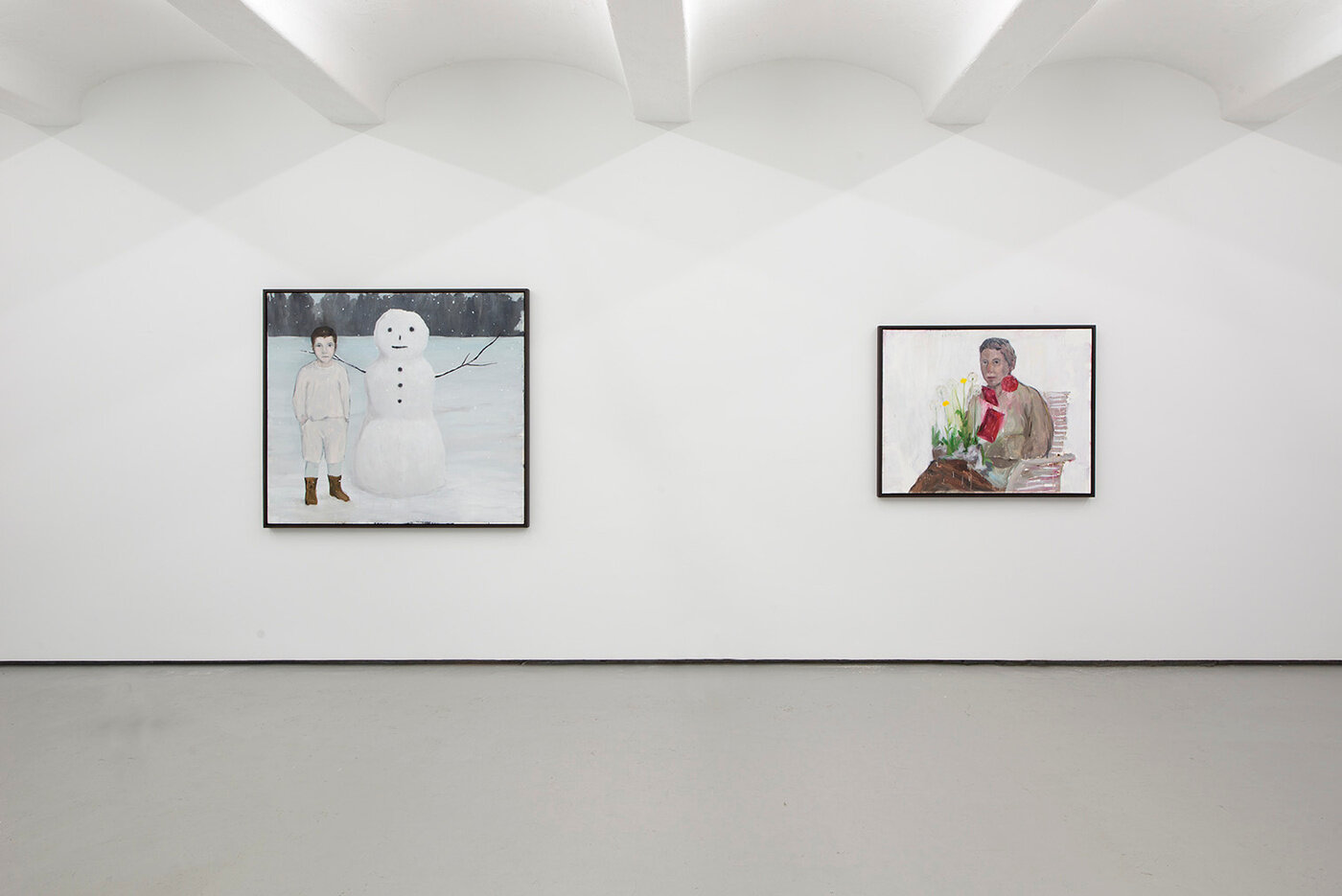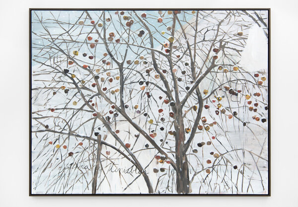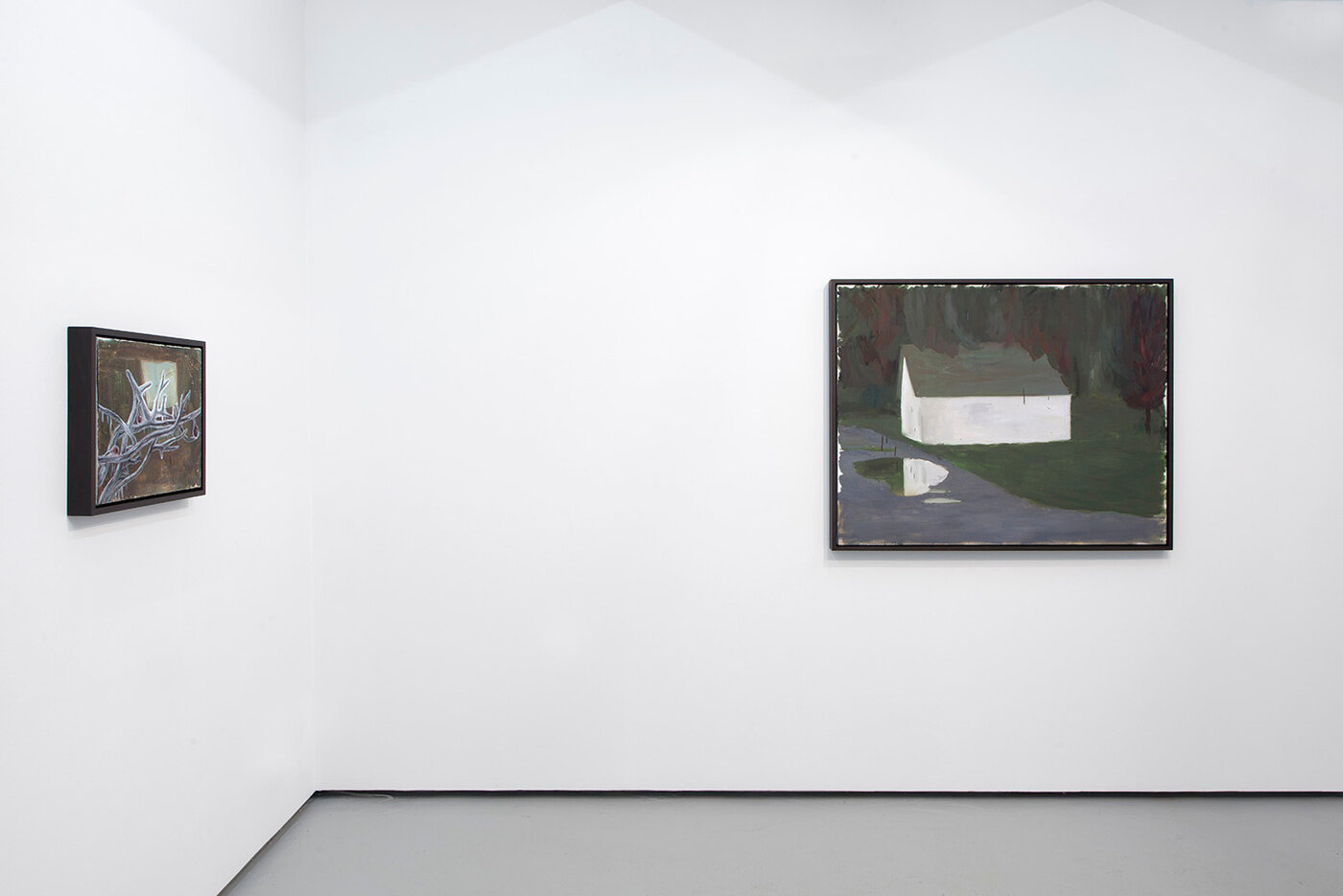 Many of the paintings offer scenes of disrupted journeys or the aftermath of significant episodes: stairs abandoned in fields, snow globes as souvenirs from elsewhere, tattoos that historicize the body, a glass house lost in a cluster of firs, apples frozen and rotting in the tree, and the underlying structure of columns left unfinished. These moments of abandonment and failure also contain the seed of possibility and renewal whose hopefulness echoes the artist's informed but non-cynical approach to art in general and to painting in particular. In The Folktale (2017), marble stairs are isolated in a grassy clearing; they don’t appear to lead anywhere and a fire burns in the distance, but colorful wildflowers sprout, birds flutter, and sunlight ripples suggesting hope and rebirth.