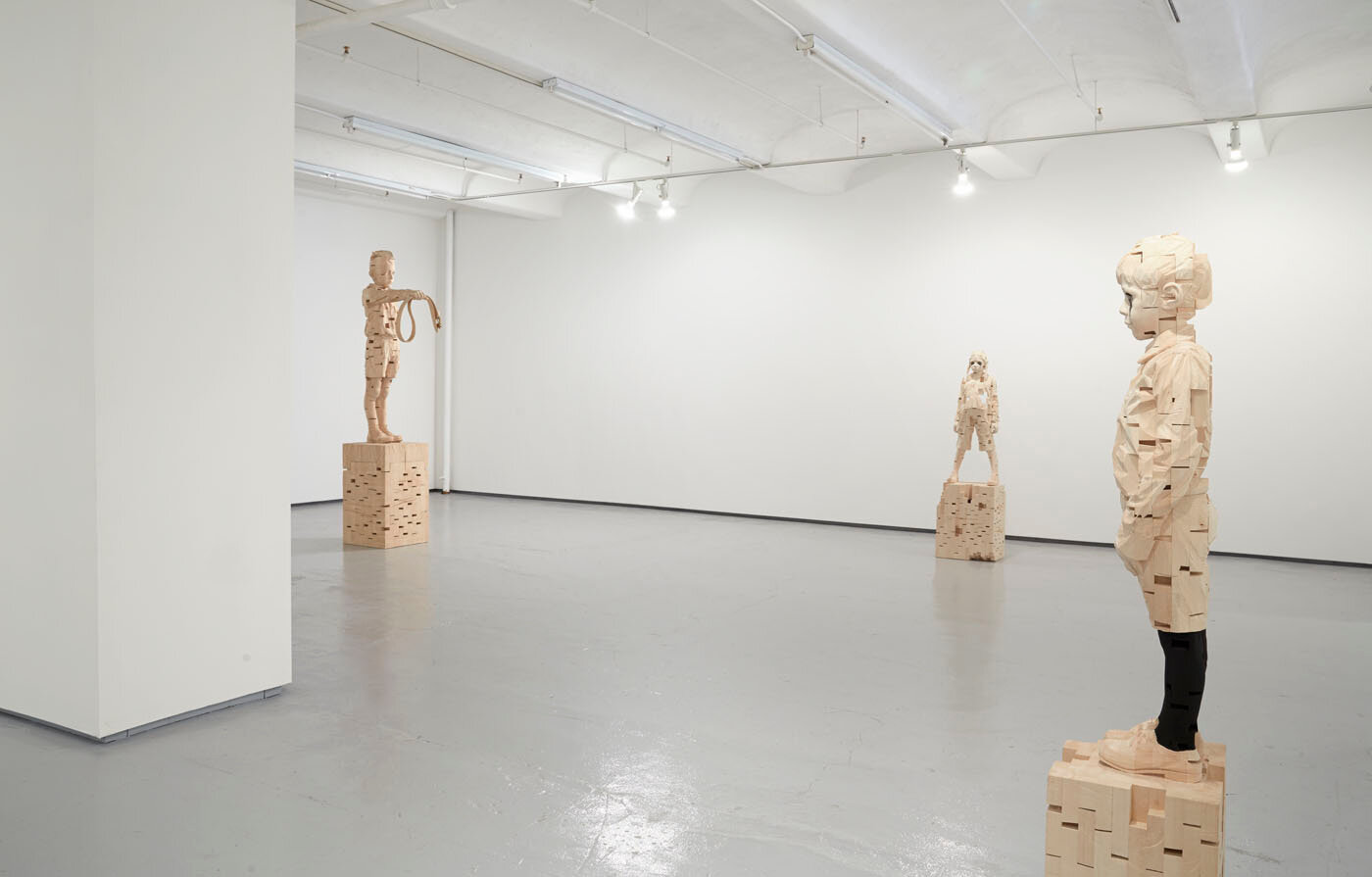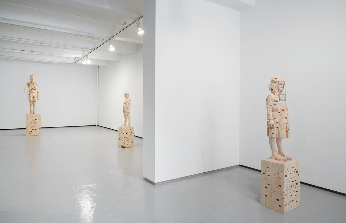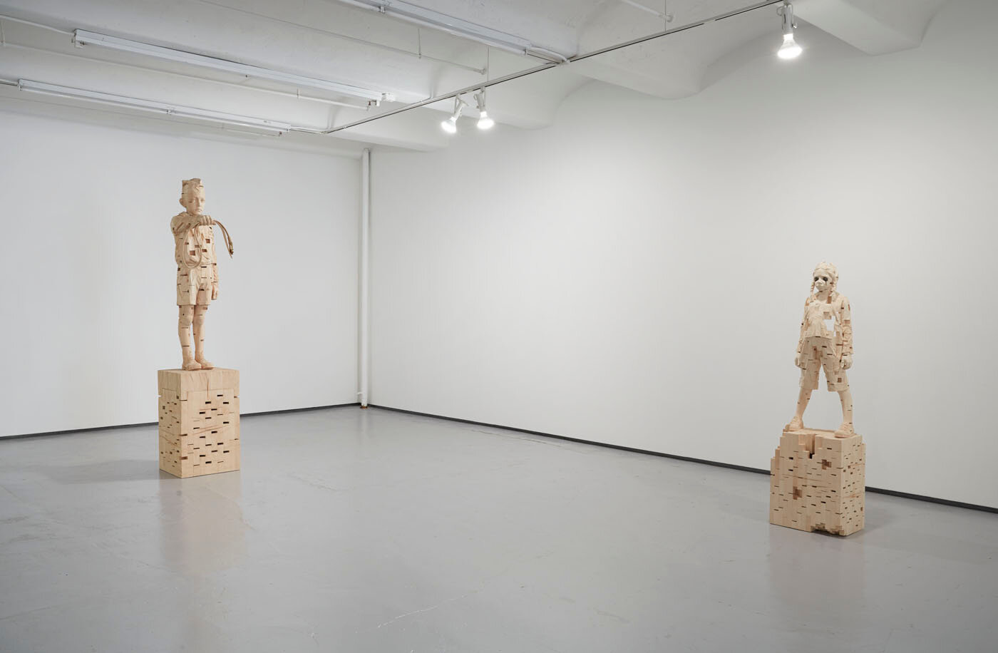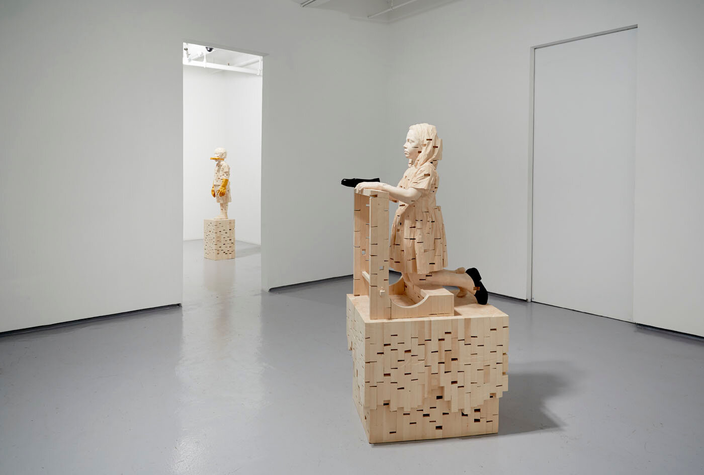 In his second exhibition with the gallery, Demetz continues his exploration of contemporary issues through the traditional practice of woodcarving. With impeccable craftsmanship, Demetz builds figures and reliefs of children and rural, often religious, architectural forms. While his subjects often take the forms of adolescent or very young children who are at the precipice of self-realization, their grave expressions and powerful stances suggest something much less innocent than their ages might suggest. Situated on plinths, these life-size works are elevated above their natural stature, allowing them to confront adults at eye level with a fierce or introspective gaze far beyond their years. Rather than being carved from a single large block of wood, these sculptures are built up from smaller rectangular units–mimicking classic building blocks–with gaps in their structures like pieces missing from their bodies or lost fragments of their being. In The siblings in me, 2014, a second, mask-like younger face grows from the figure, and underscores the tenuous and short-lived moment in childhood when one is not wholly a child, but not yet an adult.
