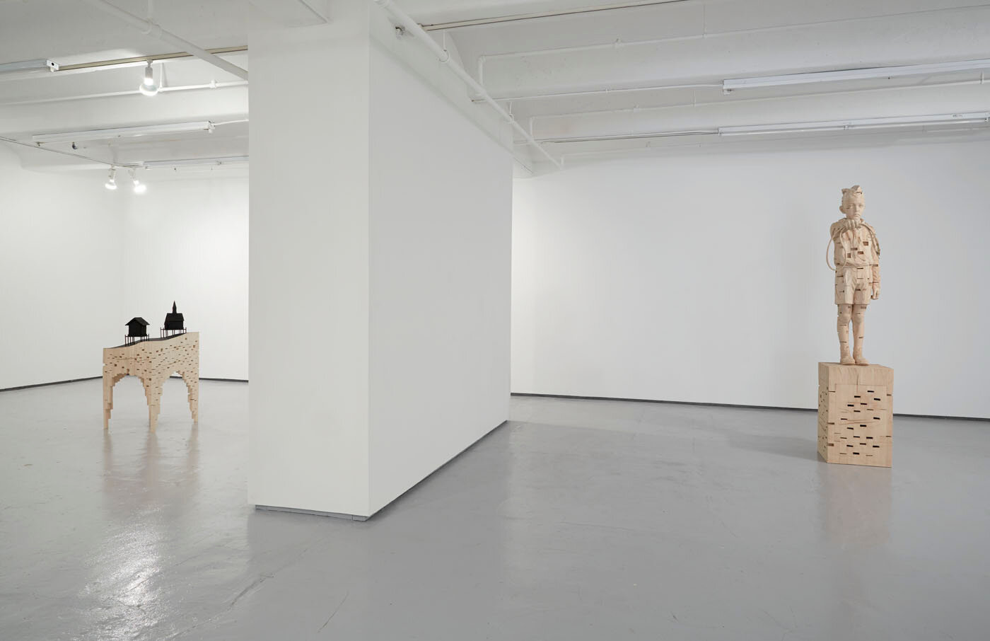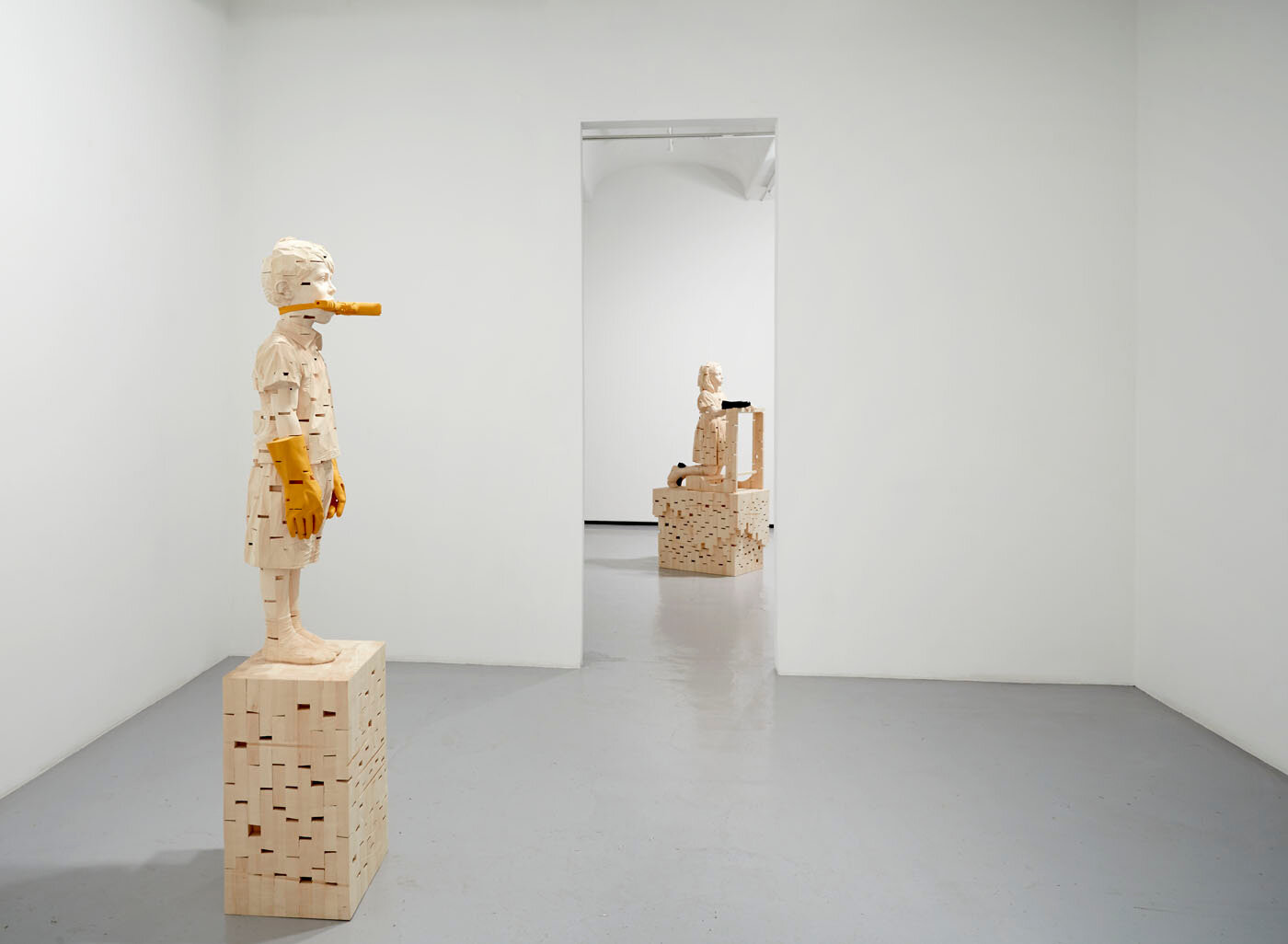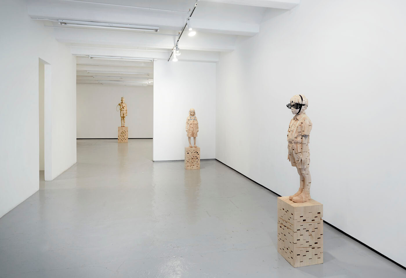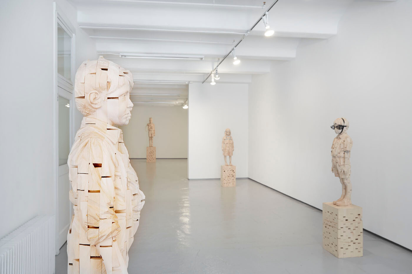 In his second exhibition with the gallery, Demetz continues his exploration of contemporary issues through the traditional practice of woodcarving. With impeccable craftsmanship, Demetz builds figures and reliefs of children and rural, often religious, architectural forms. While his subjects often take the forms of adolescent or very young children who are at the precipice of self-realization, their grave expressions and powerful stances suggest something much less innocent than their ages might suggest. Situated on plinths, these life-size works are elevated above their natural stature, allowing them to confront adults at eye level with a fierce or introspective gaze far beyond their years. Rather than being carved from a single large block of wood, these sculptures are built up from smaller rectangular units–mimicking classic building blocks–with gaps in their structures like pieces missing from their bodies or lost fragments of their being. In The siblings in me, 2014, a second, mask-like younger face grows from the figure, and underscores the tenuous and short-lived moment in childhood when one is not wholly a child, but not yet an adult.