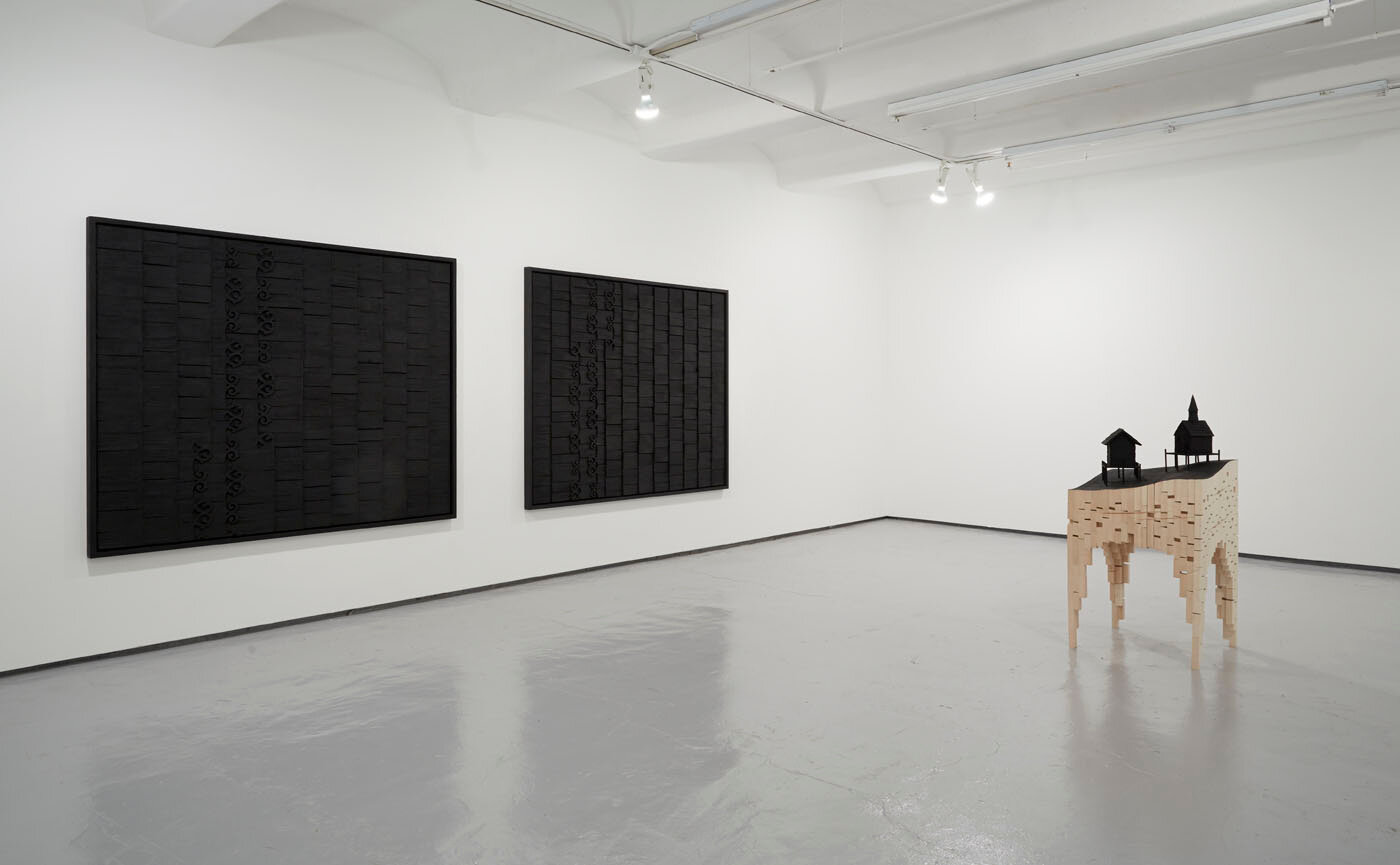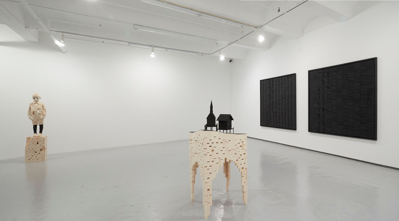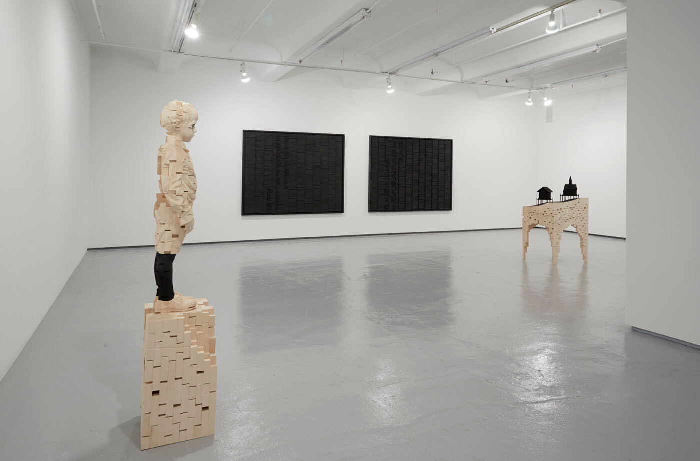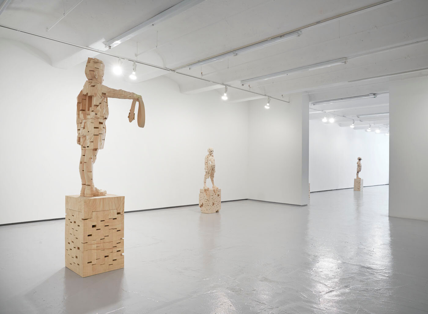 In his second exhibition with the gallery, Demetz continues his exploration of contemporary issues through the traditional practice of woodcarving. With impeccable craftsmanship, Demetz builds figures and reliefs of children and rural, often religious, architectural forms. While his subjects often take the forms of adolescent or very young children who are at the precipice of self-realization, their grave expressions and powerful stances suggest something much less innocent than their ages might suggest. Situated on plinths, these life-size works are elevated above their natural stature, allowing them to confront adults at eye level with a fierce or introspective gaze far beyond their years. Rather than being carved from a single large block of wood, these sculptures are built up from smaller rectangular units–mimicking classic building blocks–with gaps in their structures like pieces missing from their bodies or lost fragments of their being. In The siblings in me, 2014, a second, mask-like younger face grows from the figure, and underscores the tenuous and short-lived moment in childhood when one is not wholly a child, but not yet an adult.