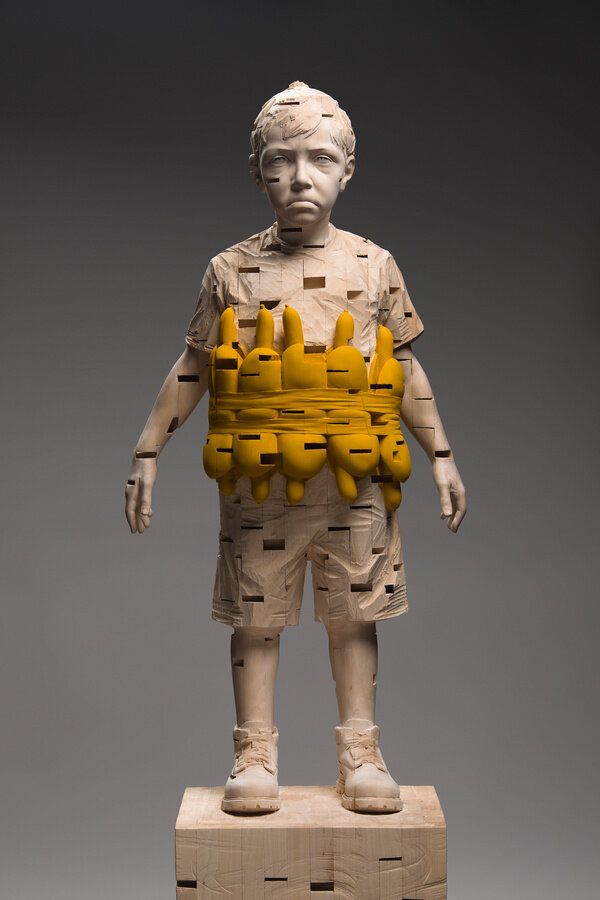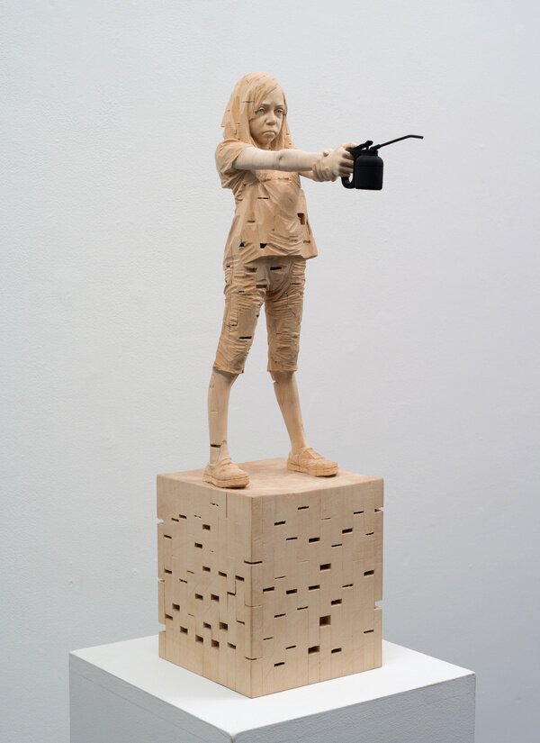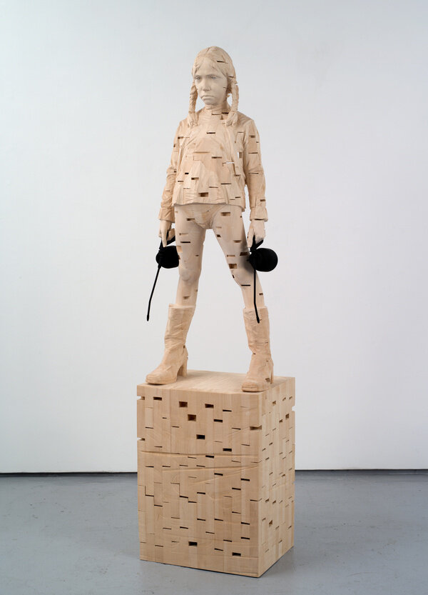 Demetz’s sculptures are carved from modular pieces of wood combined into a single form. In some cases, Demetz casts these sculptures in bronze. Spaces are left empty within these hyper realistic figures, forming abstract geometric incisions and protrusions, an active negative space. Both formally and conceptually the contradictions are strong between, the unity and multiplicity of the sculptures, the traditional practice and the contemporary subjects, the sacred and the profane, and innocence and the loss thereof.