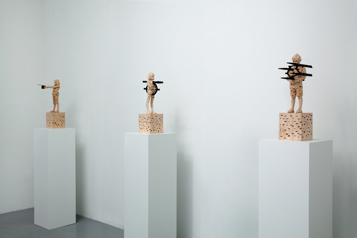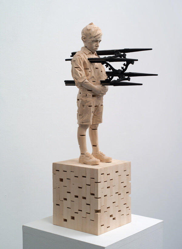 Using the vocabulary and materials of traditional woodcarving, Demetz investigates contemporary culture and its destructive tendency, not simply through the antics of children, but through the larger forces of war, religion, and politics. His work explores this delicate dichotomy between child-like innocence and blind, naïve malice. The child’s perceived malevolence is characterized by numb, often blank facial expressions that confront the viewer. Kristen Nordahl writes, “They examine everything very carefully, scrutinize adult motivations and tend to take a critical view of world affairs. They play with fire, probing the boundaries of their own power. They walk a fine line between being a child and becoming an adult, between unconscious action and conscious behavior, between playful innocence and painful awakening.”