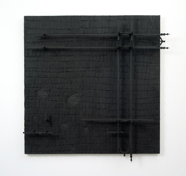 Demetz’s wall reliefs take the artist’s familiar tropes and open them up to a flatter and more abstracted plane. Continuing to use bronze and wood, the works move from the centralized subject to a wider exploration of the surface, texture and object.