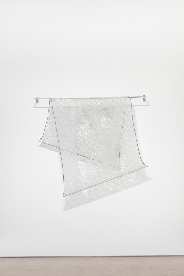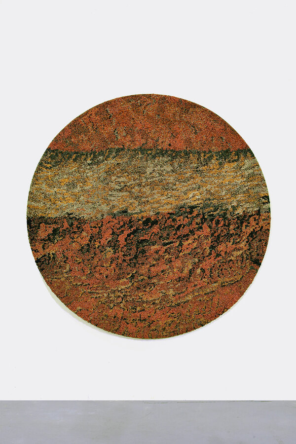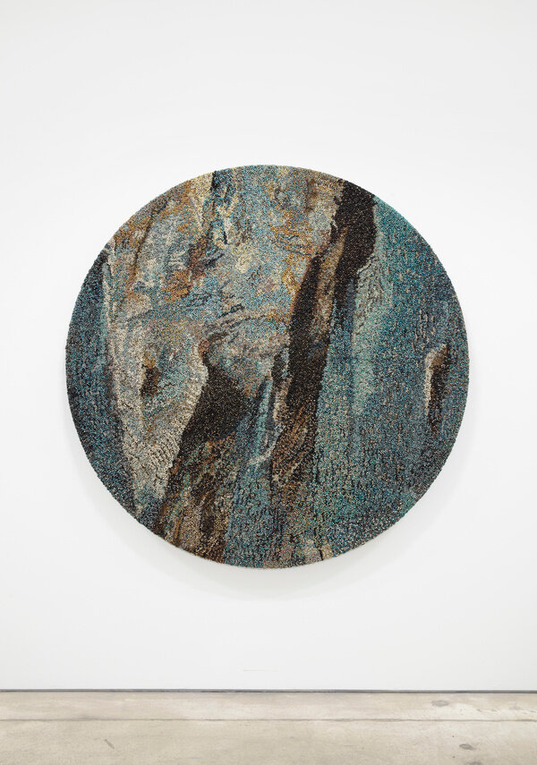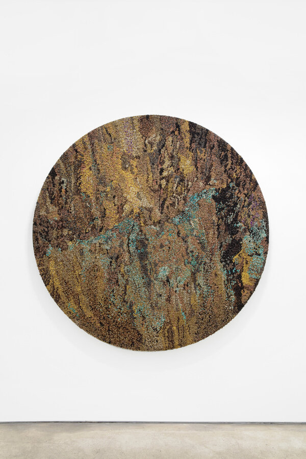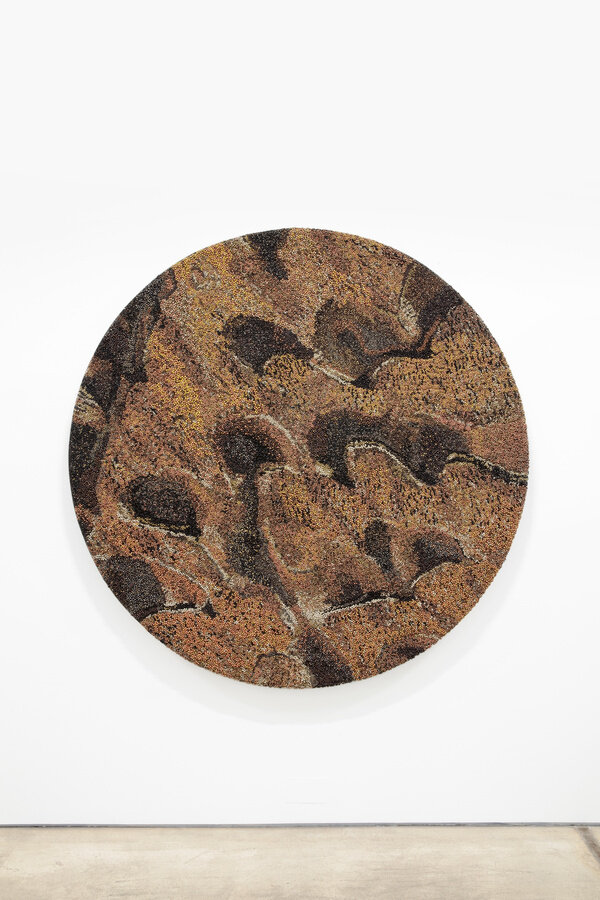 A pillar of life, water is also central to Galhotra’s artistic practice. Her work has been deeply influenced by the Yamuna River, a sacred source of life that flows through the city of New Delhi and is in a critical state of exploitation and pollution. Her new series is specifically concerned with the water crisis, as the earth faces an increasing shortage of viable freshwater sources, and turns to the evidence of water on Mars as an answer. Using intricately woven metal ghungroos characteristic of her practice, Galhotra deconstructs images of the surface of Mars sourced from NASA research to create surreal, celestial landscapes. Through her meticulous, effortful process, Galhotra interrogates a utopian vision of Mars, the shimmering beauty of the resulting works revealing both the hope and delusion of an interplanetary escape.