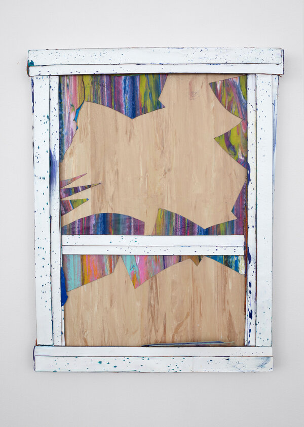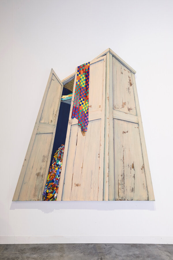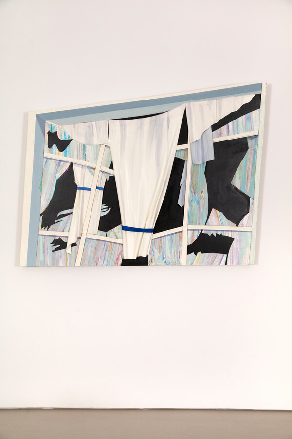 In two distinct, yet related bodies of work depicting containers and windows, shaped panels in exaggerated and skewed perspectives determine the painted object. Door and window frames, armoires, closets and shelves are rendered through constructed panels and an abstract and three-dimensional handling of paint. With this practice, Wayne explores conventional representation and figure-ground relationships. What is illusion and what is, in fact, real becomes tensely blurred. The large scale of these paintings invites further questioning as one could envision stepping across the threshold and into their imagined interiors.