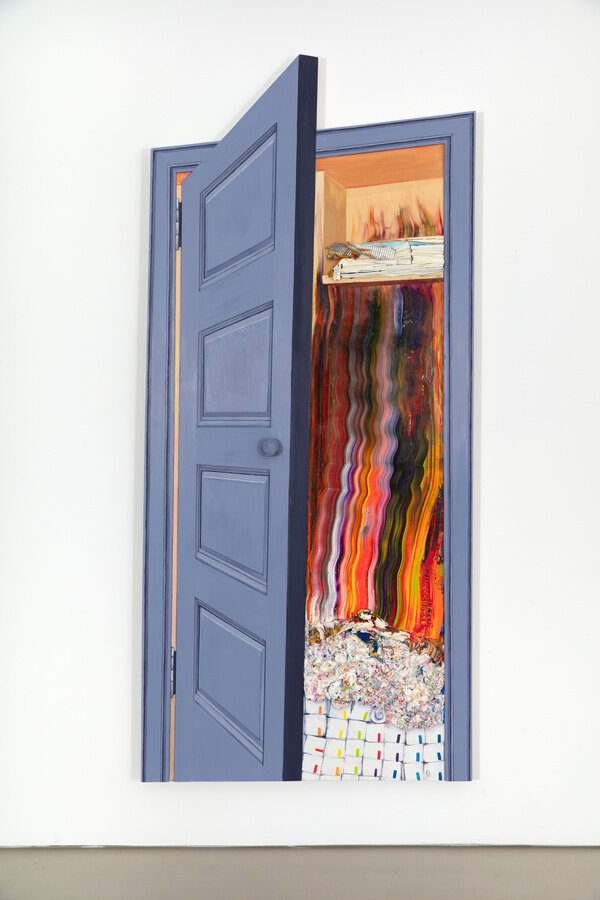 Wayne’s closets and containers are zones of refuge and comfort from the outside world; but they also contain the artist’s secrets and anxieties about the current state of political affairs: climate denial, nuclear proliferation, immigration, and ongoing institutionalized racism that point to a breakdown of the cultural and moral fabric of our society. Paintings of broken and boarded up windows, or those in which a sort of toxic ooze seeps through the blinds, serve as metaphors for this unease. Largescale paintings of cabinets, closets and shelves can be seen from the point of view of a small child peering into a forbidden space or up towards something just out of reach. These paintings take on an almost German Expressionist perspective of an environment that is not quite right.